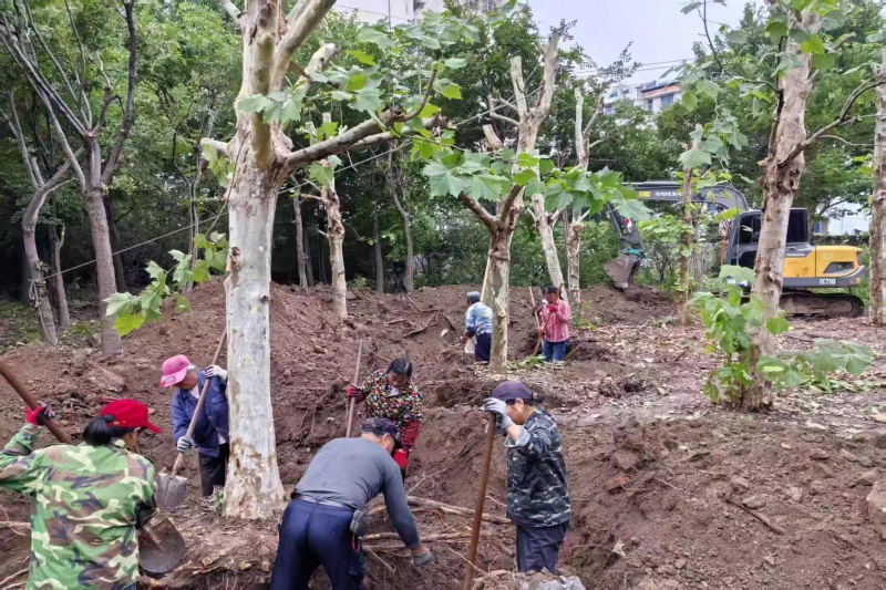 本項目涉及移植樹木417株、清除無利用價值樹木29株。面對工期緊、任務(wù)重以及梅雨季節(jié)等諸多挑戰(zhàn),施工隊制定“人機協(xié)同+工序并行”方案,采用修剪控冠、分株斷根等專業(yè)技術(shù),配置土球包扎、傷口涂抹修復(fù)劑等保護措施,優(yōu)化起挖、運輸、栽植流程,確保苗木成活率。在清除無利用價值樹木環(huán)節(jié),落實安全管理措施,對無利用價值的樹木進行安全清除。